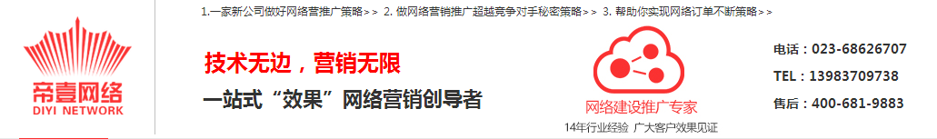 帝壹網(wǎng)絡(luò)10余年專(zhuān)業(yè)從事:網(wǎng)絡(luò)營(yíng)銷(xiāo)、網(wǎng)絡(luò)推廣、視頻推廣、網(wǎng)站推廣的一家重慶網(wǎng)絡(luò)公司-16年專(zhuān)注:seo優(yōu)化排名技術(shù)、網(wǎng)站建設(shè)-公司品牌宣傳打造;生產(chǎn)型產(chǎn)品的推廣獲客實(shí)戰(zhàn)專(zhuān)家