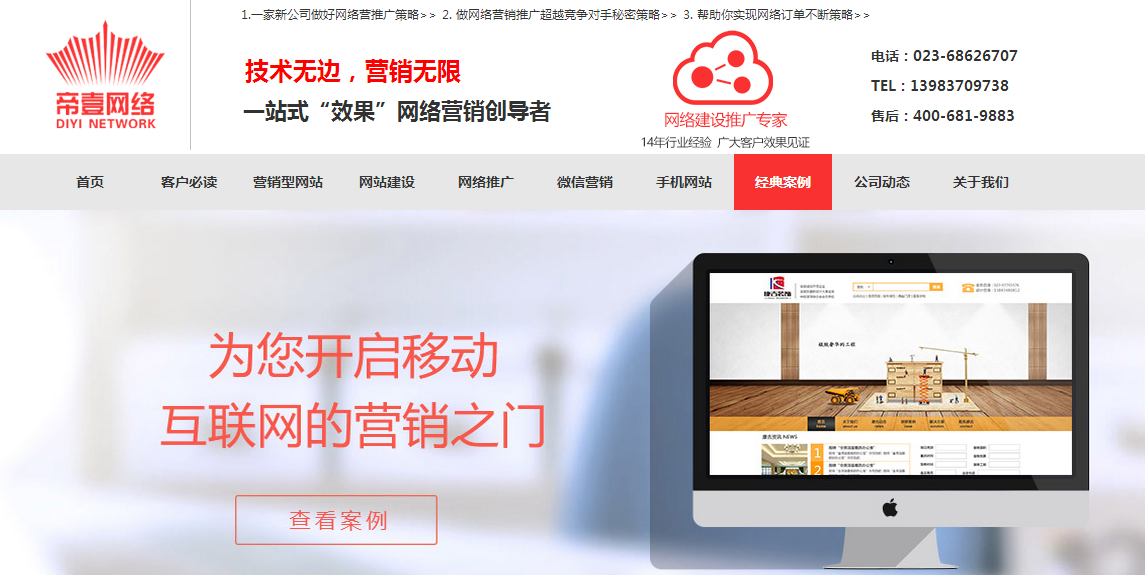 帝壹網(wǎng)絡(luò)10余年專業(yè)從事:網(wǎng)絡(luò)營銷、網(wǎng)絡(luò)推廣、視頻推廣、網(wǎng)站推廣的一家重慶網(wǎng)絡(luò)公司-16年專注:seo優(yōu)化排名技術(shù)、網(wǎng)站建設(shè)-公司品牌宣傳打造;生產(chǎn)型產(chǎn)品的推廣獲客實(shí)戰(zhàn)專家